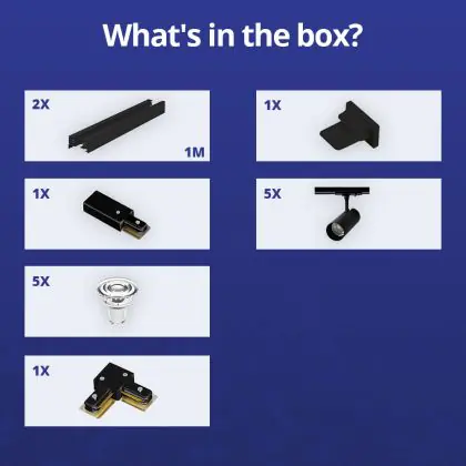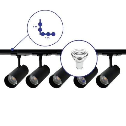 Beschrijving Complete Set 1-Fase Rail L 1 x 1 Meter Zwart | incl. 5x Spot + GU10 2700K 3W Dimbaar + Eindkap, Voedingsconnector en L -Verbindingsstuk
