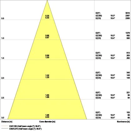 De lichtopbrengst en de gradenbundel spelen een grote rol. Zo geeft de lichtopbrengst van 640 Lumen in combinatie met de 36° stralingshoek deze inbouwspot een specifieke toepassing. Kort samengevat is een lichtintensiteit van maximaal 400 Lumen ideaal voor accentverlichting, terwijl hogere waardes goed gebruikt kunnen worden als basisverlichting. Over het algemeen geldt: hoe breder de gradenbundel, hoe geschikter deze is door basisverlichting. Dit komt doordat het licht over een groter oppervlak wordt verspreid. Smallere gradenbundels (tot 40°) kunnen echter bij hoge plafonds ook goed tot hun recht komen als algemene verlichting.