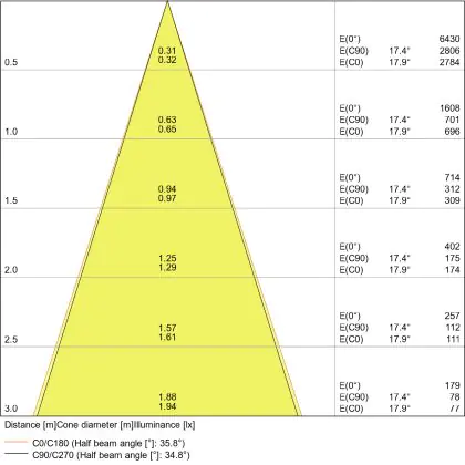 De lichtopbrengst en de gradenbundel spelen een grote rol. Zo geeft de lichtopbrengst van 650 Lumen in combinatie met de 36° stralingshoek deze inbouwspot een specifieke toepassing. Kort samengevat is een lichtintensiteit van maximaal 400 Lumen ideaal voor accentverlichting, terwijl hogere waardes goed gebruikt kunnen worden als basisverlichting. Over het algemeen geldt: hoe breder de gradenbundel, hoe geschikter deze is door basisverlichting. Dit komt doordat het licht over een groter oppervlak wordt verspreid. Smallere gradenbundels (tot 40°) kunnen echter bij hoge plafonds ook goed tot hun recht komen als algemene verlichting.
