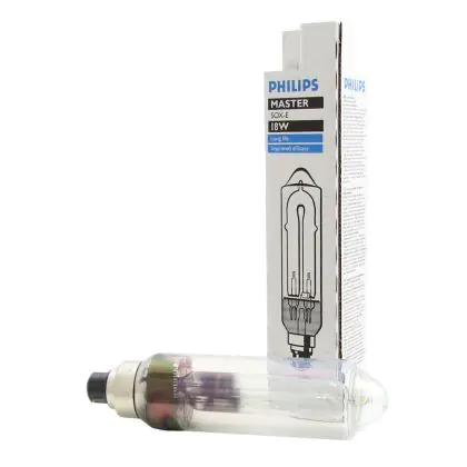 SOX E 18W van Philips is een lagedruk natriumlamp. Dit is de meest efficiënte gasontladingslamp op de markt, dat houdt in dat u het meeste licht krijgt per watt dat deze lamp verbruikt.